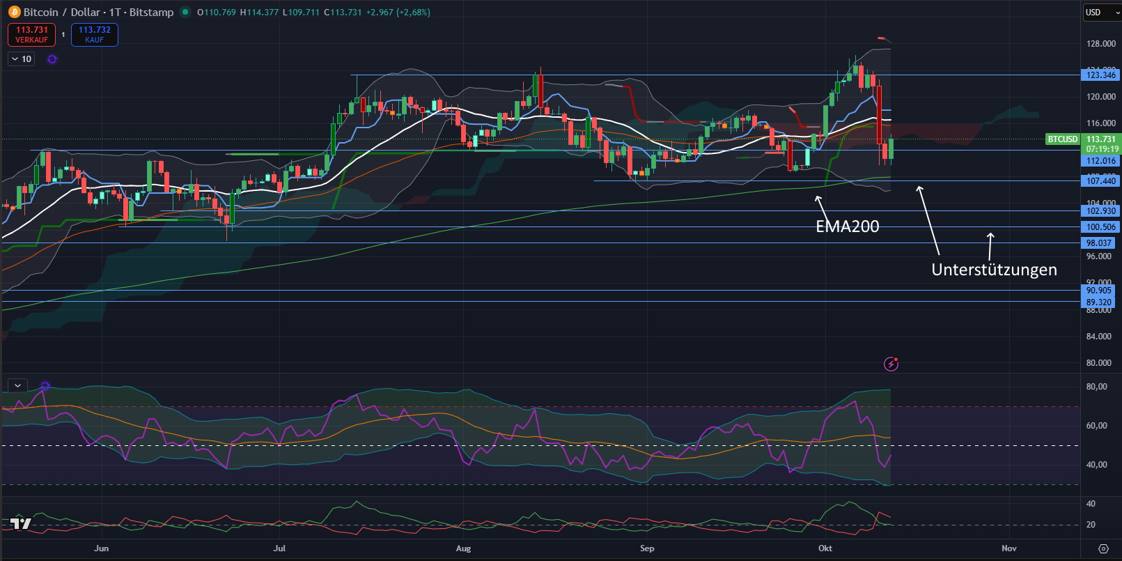 12.10.2025: Der Bitcoin (USD) hat noch einmal die Unterstützungszone zwischen 110.000 und 108.ooo USD angesteuert. Hier befindet sich auch der gleitenden Durchschnitt EMA200. Sollte diese Unterstützung halten, wird der Bitcoin wieder das Allzeithoch bei 125.000 USD anlaufen.