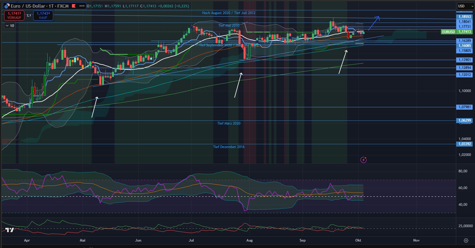 03.10.2025: Die Aufwärtsbewegung des Devisenpaar EUR/USD ist zwar noch intakt, aber nicht sehr dynamisch. Allerdings sind die letzten Bewegungstiefs weiterhin aufsteigend (mir Pfeilen markiert). Solange das letzte Bewegungstief bei 1,1650 USD nicht unterschritten wird, ist der Aufwärtstrend weiter intakt.