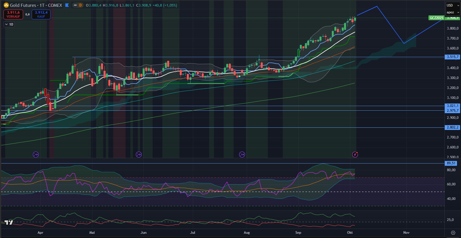 03.10.2025: Der Chart von Gold (USD) ist aus der Seitwärtsbewegung über das letzte Allzeithoch knapp über 3.500 USD ausgebrochen. Es könnte bald einen Rücksetzer Richtung Ausbruchsniveau stattfinden (ReTest) oder auch nur bis zum SMA20 auf Tagesbasis bei derzeit 3.750 USD. Solange dieses Ausbruchsniveau bei 3515 USD nicht mehr unterschritten wird, ist aus technischer Sicht ein neues längerfristiges Kaufsignal generiert worden und somit ist mit weiter ansteigenden Kursen bei Gold zu rechnen.