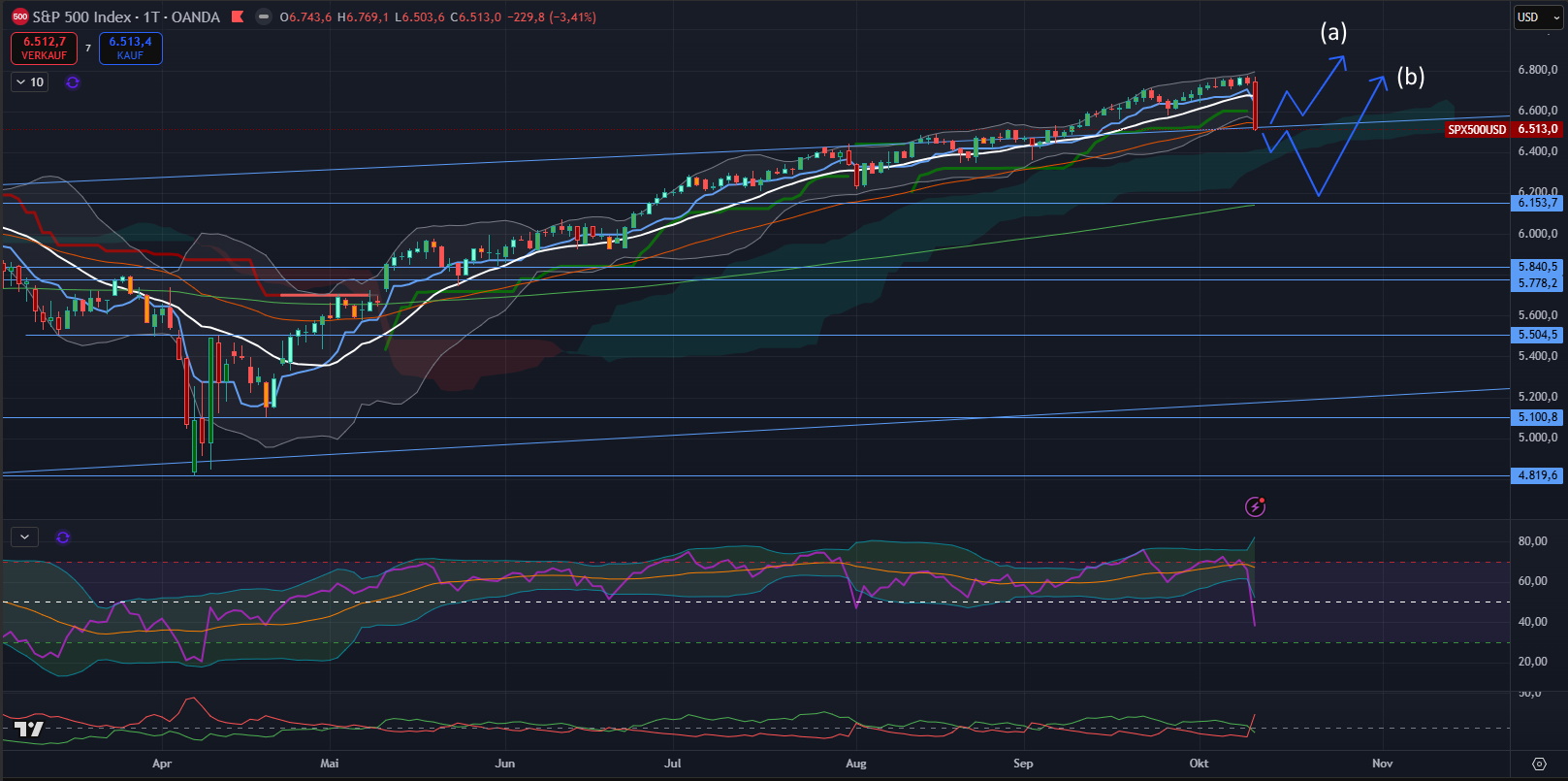 10.10.2025: Der S&P 500 hat am Freitag mit einem beeindruckenden “bearish engulfing” die obere Begrenzung des früheren Aufwärtstrendkanals getestet. Die bullische Variante wäre nun eine rasche Aufwärtsbewegung nach diesem ReTest des früheren Ausbruchs (a).