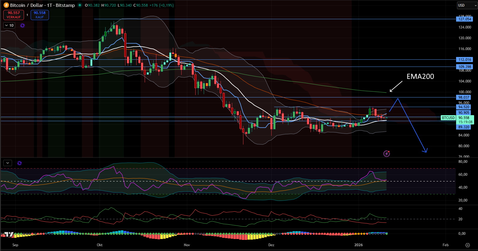11.01.2026: Der Bitcoin (USD) befindet sich nach dem starken Kursrückgang bis fast 80.000 USD noch immer in einer Seitwärtsbewegung. Zwar könnte es zwischenzeichtlich eine moderate Aufwärtskorrektur bis in den Bereich von 100.000 USD geben, bevor der Bitcoin noch einmal das jüngste Bewegungstief testen dürfte, schlimmstenfalls mit einem stärkeren Abverkauf bis 74.000 USD.