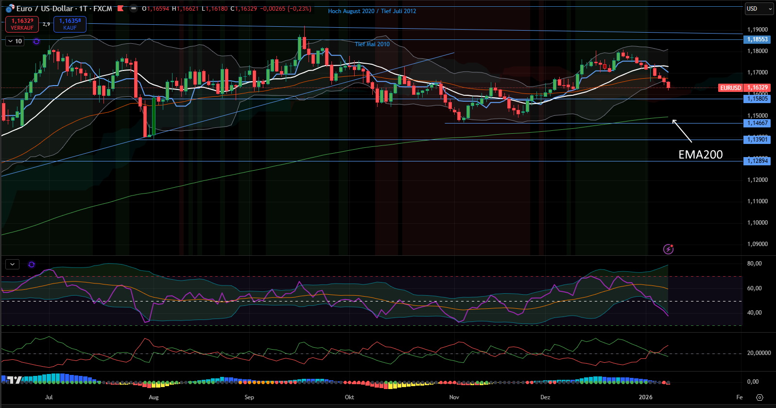 09.01.2026: Das letzte Bewegungshoch Ende Dezember 2025 beim EUR/USD erreichte nicht mehr das Hoch aus September 2025 und ging in eine mehrtägige Abwärtsphase über. Das ist grundsätzlich ein Warnsignal, daher muss damit gerechnet werden, dass noch der Bereich des EMA200 bei 1,15 USD angesteuert wird.