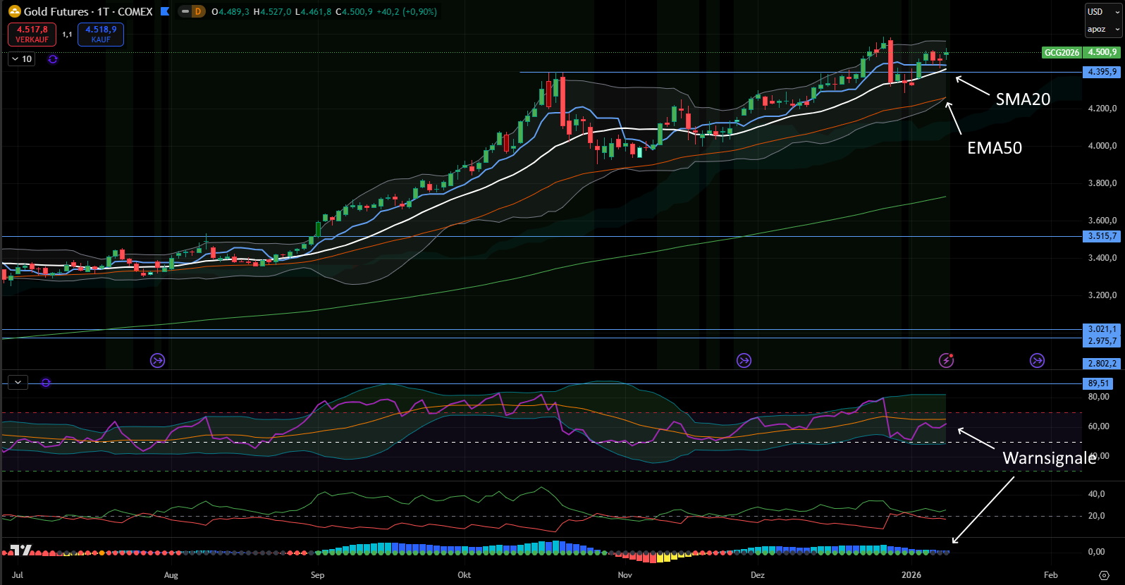 09.01.2026: Der Chart von Gold (USD) ist nach der Konsolidierung wieder in den Aufwärtsmodus übergegangen und hat das Allzeithoch von Oktober sogar schon überschritten. Anschließend erfolgte ein scharfer Rücksetzer und die nachfolgende Aufwärtsbewegung sieht bislang noch nicht allzu dynamisch aus. Daher zeigen einige Momentums-Indikatoren Warnsignale, dass sich die Konsolidierung ähnlich wie Ende Oktober 2025 noch fortsetzen könnte. Bei der letzten Konsolidierung blieb der Goldpreis oberhalb seines gleitenden Durchschnitts EMA50 auf Tagesbasis. Das bedeutet, solange der Bereich von 4.250 USD nicht unterschritten wird, ist der übergeordnete Aufwärtstrend weiter intakt.