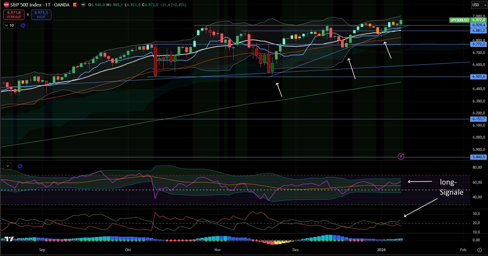 09.01.2026: Das aufsteigende Dreieck beim S&P 500 führt diesen wichtigen Aktienindex zwar langsam, aber stetig immer weiter nach oben. Oberhalb 6.900 Indexpunkten ist generell alles “long”. Ein Warnsignal wäre ein Unterschreiten von 6830.