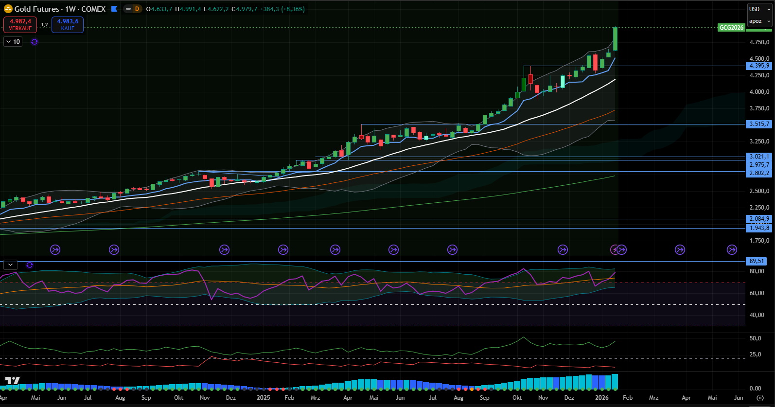 1. Aktualisierte Analyse des großen Chartbildes (W1-Goldpreis, USD, März 2020 bis Anfang Februar 2026)Basierend auf den aktualisierten Daten bis zur Woche vom 02. Februar 2026 (Close: 4.979,8 USD, High: 5.113,9 USD) und der vollständigen Serie seit März 2020 (kumulierte Rendite +243% vom Tief bei 1.450,9 USD) zeigt das Chartbild eine anhaltende, aber volatile Bullenphase. Die neuen Wochen (Dezember 2025–Februar 2026) markieren eine parabolische Rallye mit einem neuen All-Time-High (ATH) bei 5.626,8 USD (Woche 26.01.2026), gefolgt von einem scharfen Pullback (-15,7% auf Close 4.745,1 USD) und einem schnellen Rebound (+5% auf 4.979,8 USD). Dies unterstreicht eine Überhitzung, die zu Korrekturen führt, aber den langfristigen Aufwärtstrend intakt lässt. Die Analyse integriert die Datenverarbeitung (via Pandas: 10 Zeilen geparst, Summary-Stats: Mean Close ~4.511 USD, RSI-Mittel ~73, DI+-Dominanz), Trendregression (aktueller Slope ~50 USD/Woche) und Indikator-Konvergenzen.Übergeordnete Trendstruktur