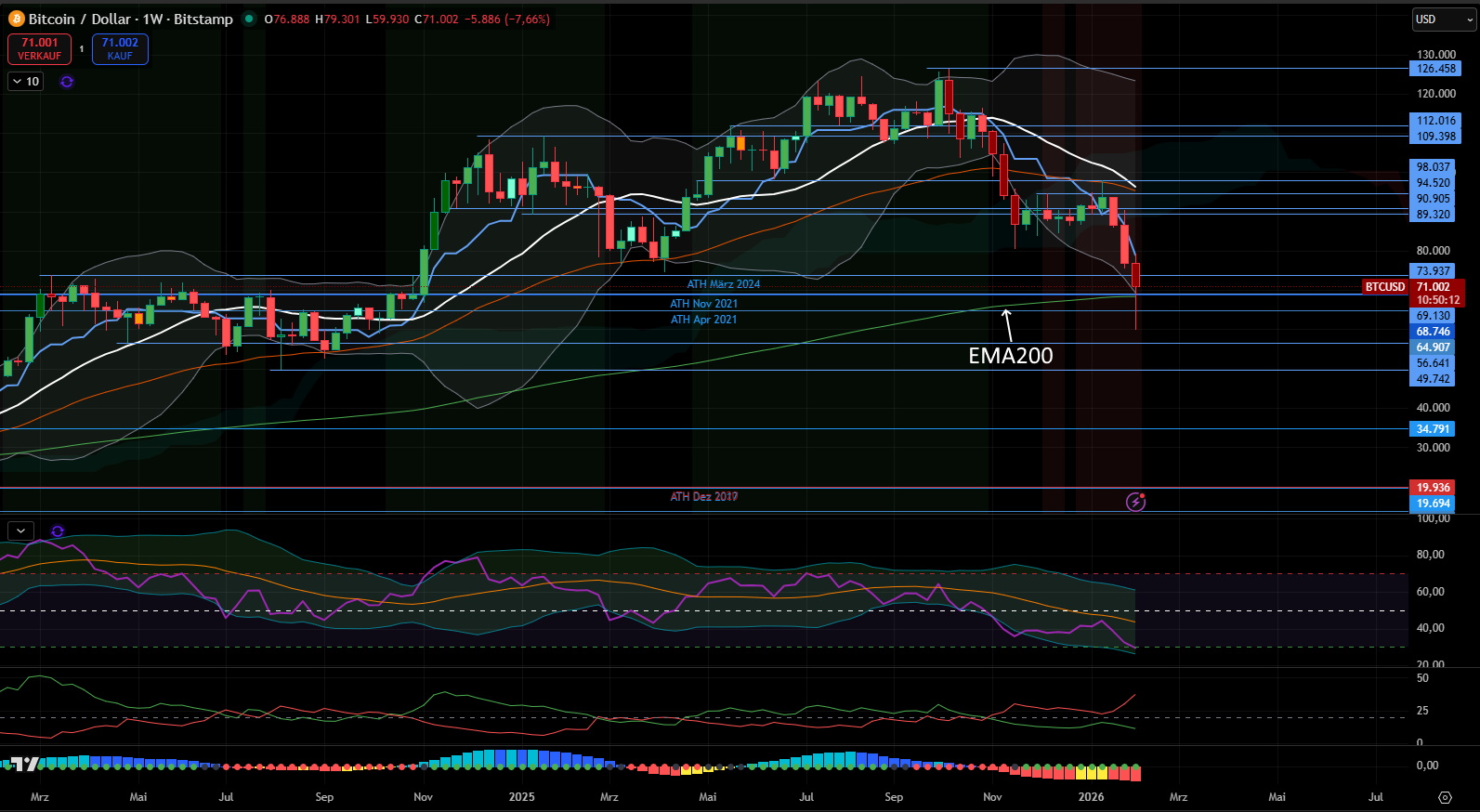 - Aktuelle Position (07.02.2026): Preis bei ~70.000–72.000 USD (angenommen leichter Rebound post-Dip, basierend auf Oversold).