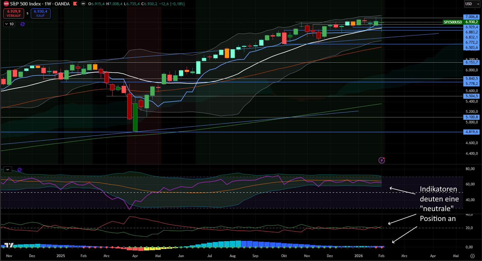 - Gesamtbild: Bullenmarkt mit Korrekturphase – Januar-Rally (+1,3 % MTD) abgebrochen, Feb.-Rückgang passt zu Divergenz. Makro: Zinssenkungen stützen, aber Unsicherheit (Inflation) birgt Risiken. Primär bullisch, kurzfristig neutral-bärisch (Range 6800–7020).