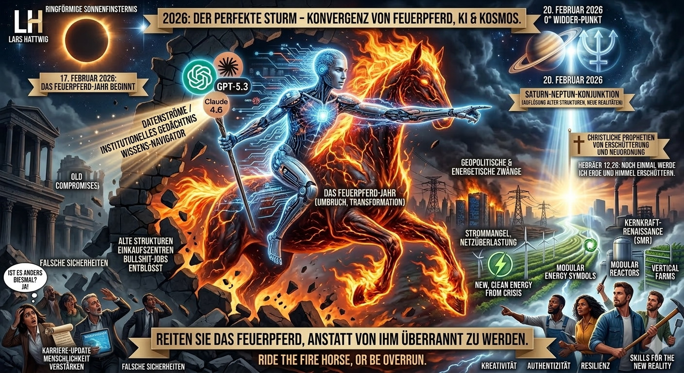 - Kosmische & Kulturelle Zyklen: Das „Feuerpferd-Jahr“ und die Saturn-Neptun-Konjunktion wirken als kollektives psychologisches Ventil. Sie treiben Menschen zu radikalen Lebensentscheidungen und dem Bruch mit alten Strukturen („Bullshit-Jobs“), was die technologische Transformation kulturell legitimiert.